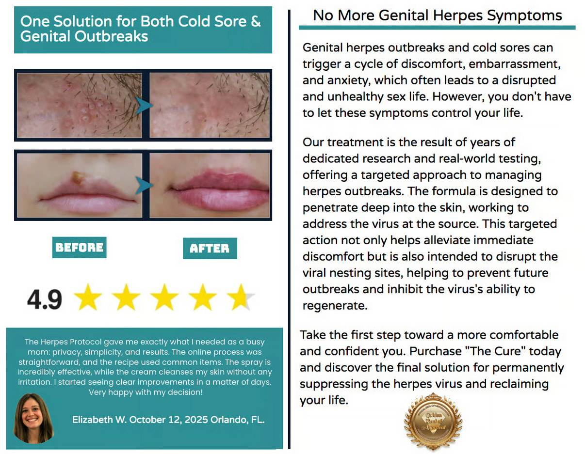 Achieve Lasting Freedom: With consistent use, The Herpes Protocol aims for a site specific cure, leading to permanent remission and preventing future outbreaks at the source.