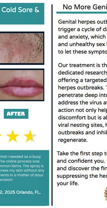 Our treatment is the result of years of dedicated research and real-world testing, offering a targeted approach to managing herpes outbreaks. The formula is designed to penetrate deep into the skin, working to address the virus at the source. This targeted action not only helps alleviate immediate discomfort but is also intended to disrupt the viral nesting sites, helping to prevent future outbreaks and inhibit the virus's ability to regenerate.